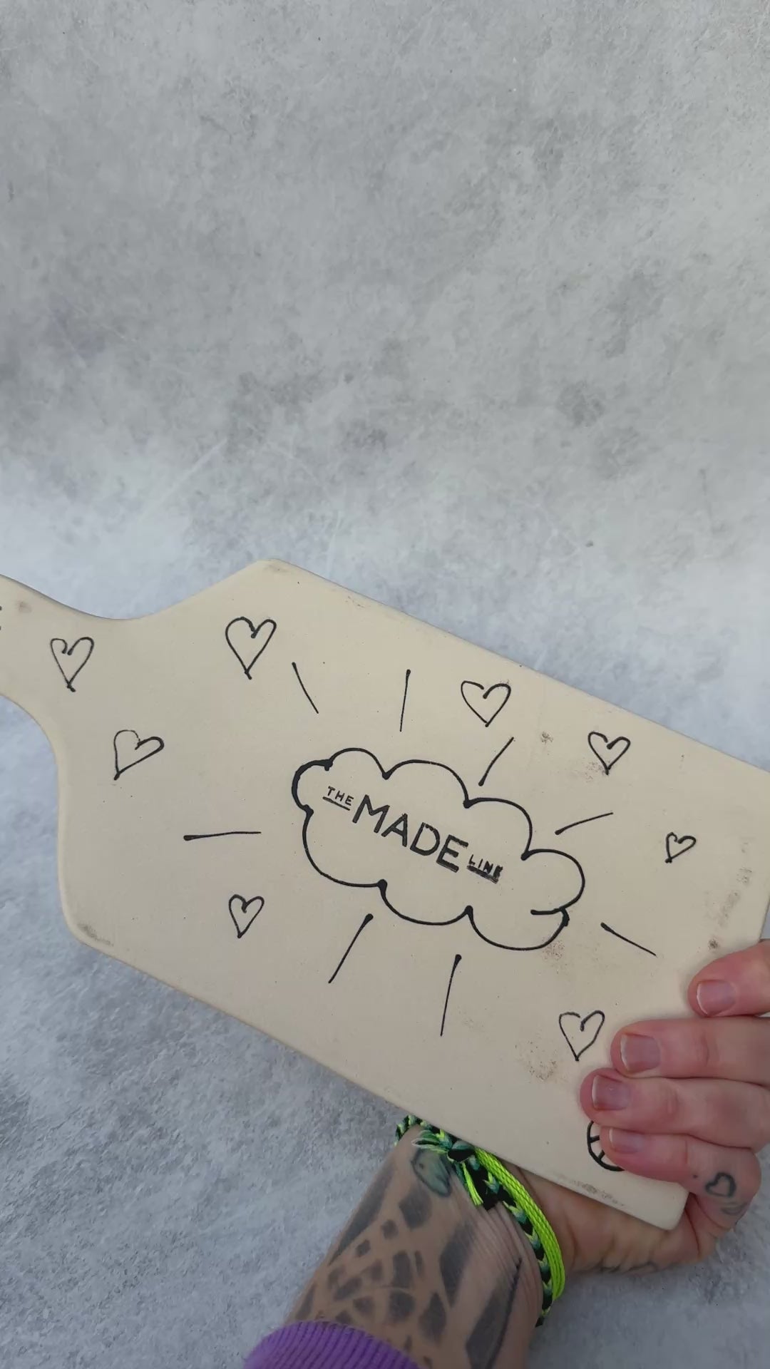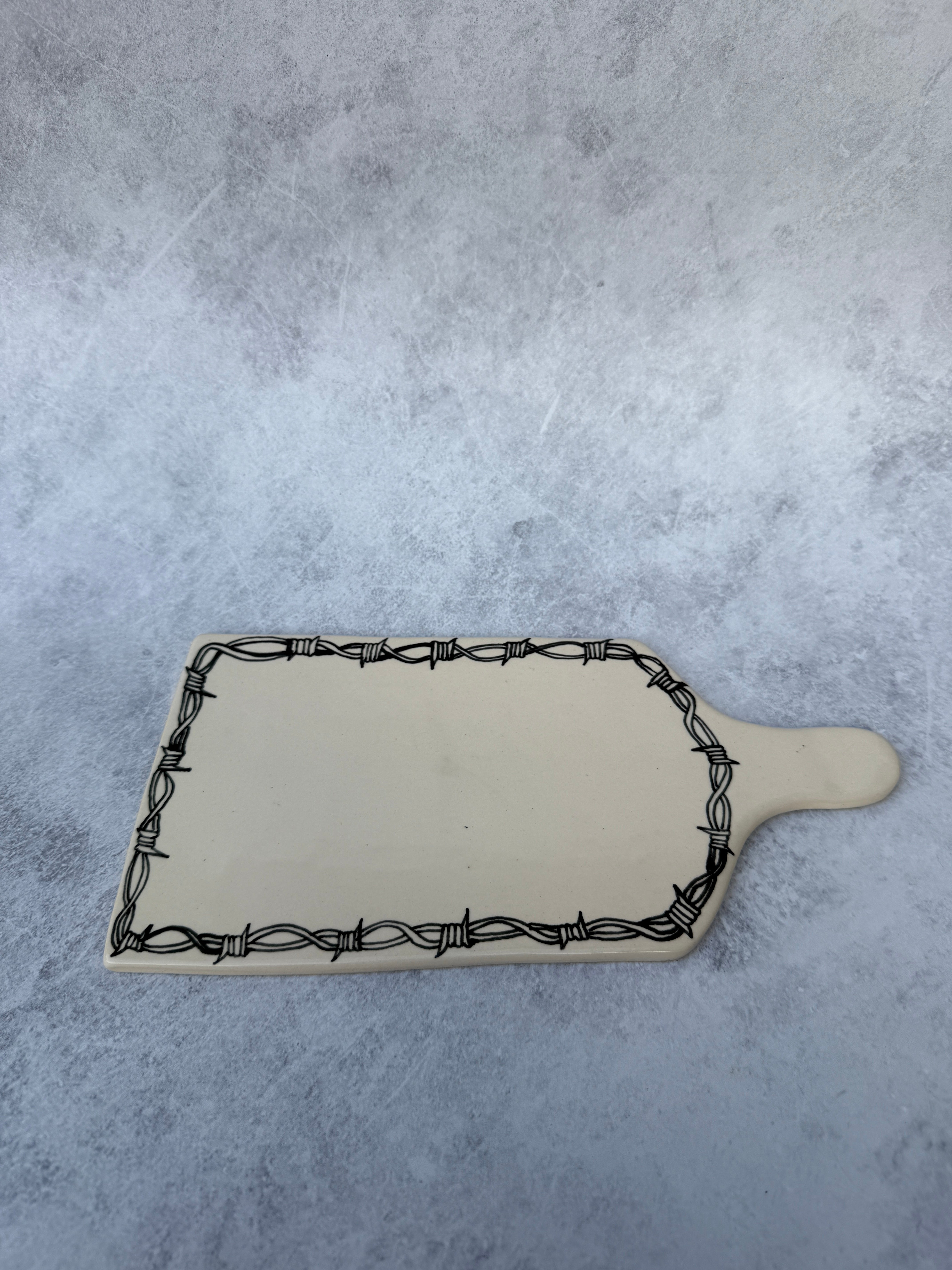 Ceramic cheese board hand painted with barbed wire around the perimeter.