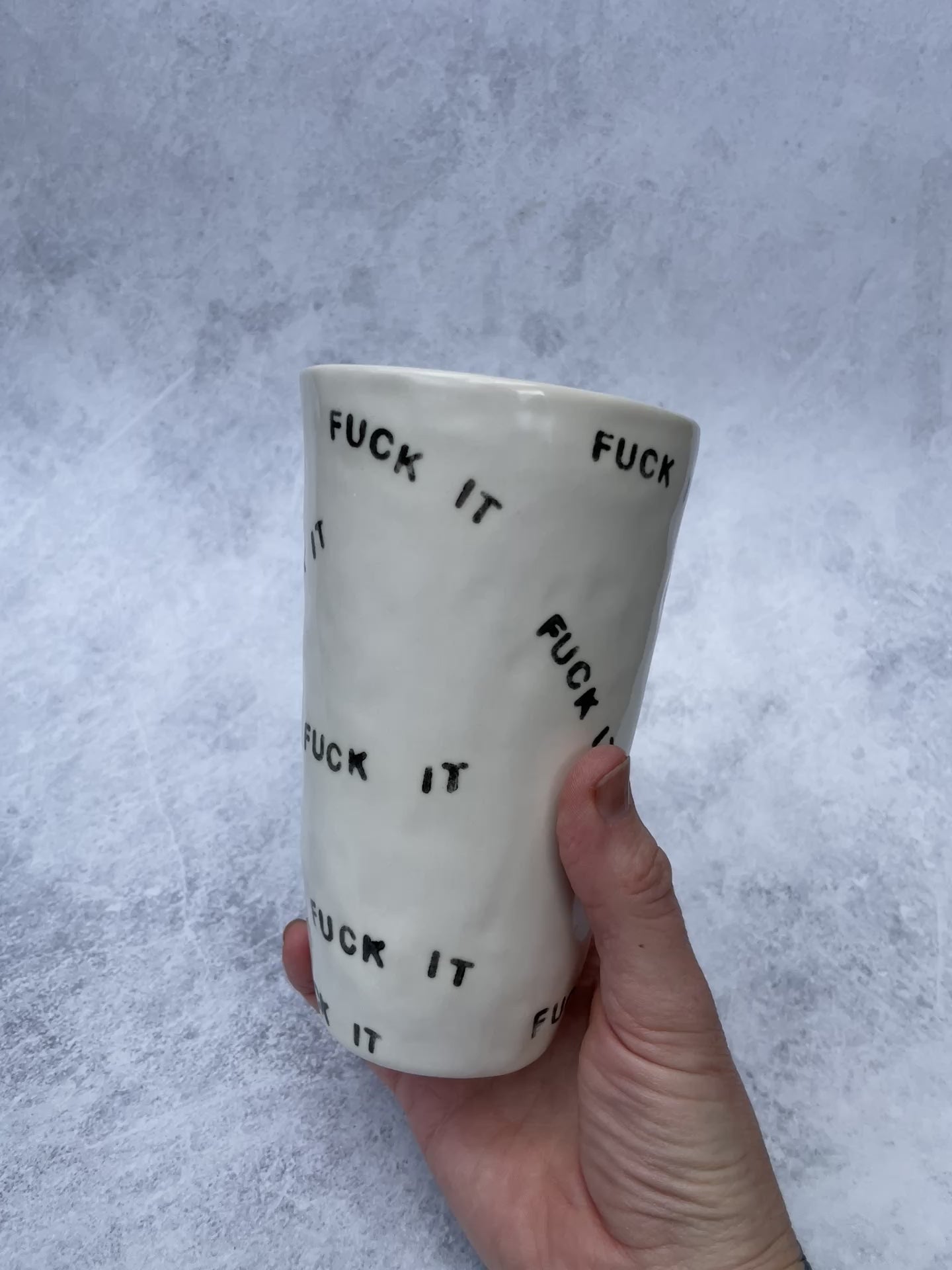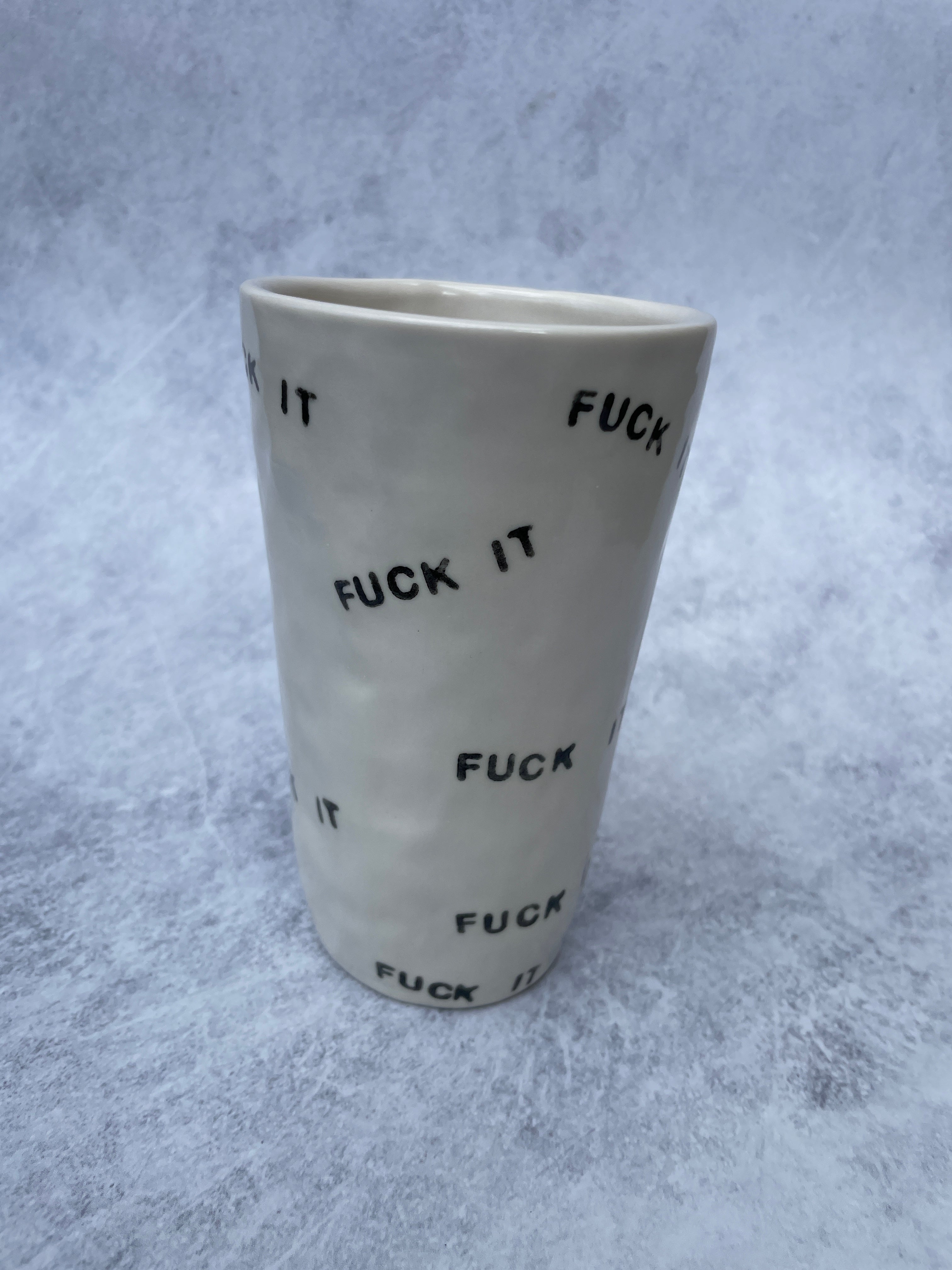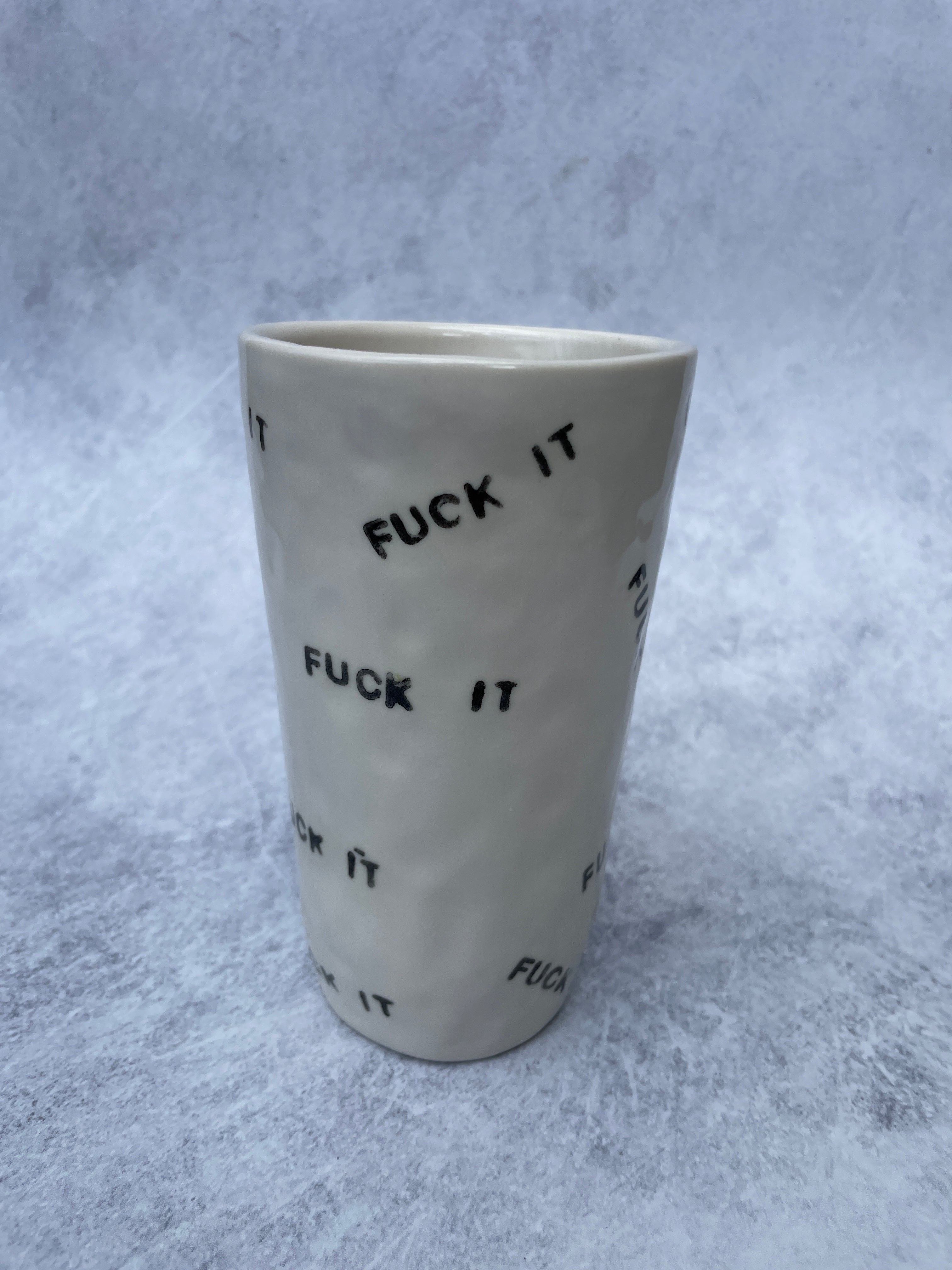 For those days when you need some solidarity from your craftware. Hand made porcelain tumbler with FUCK IT stamped all over with clear glaze inside and out, perfect for hot or cold beverages, large enough to hold all your expletives. Holds about 16oz