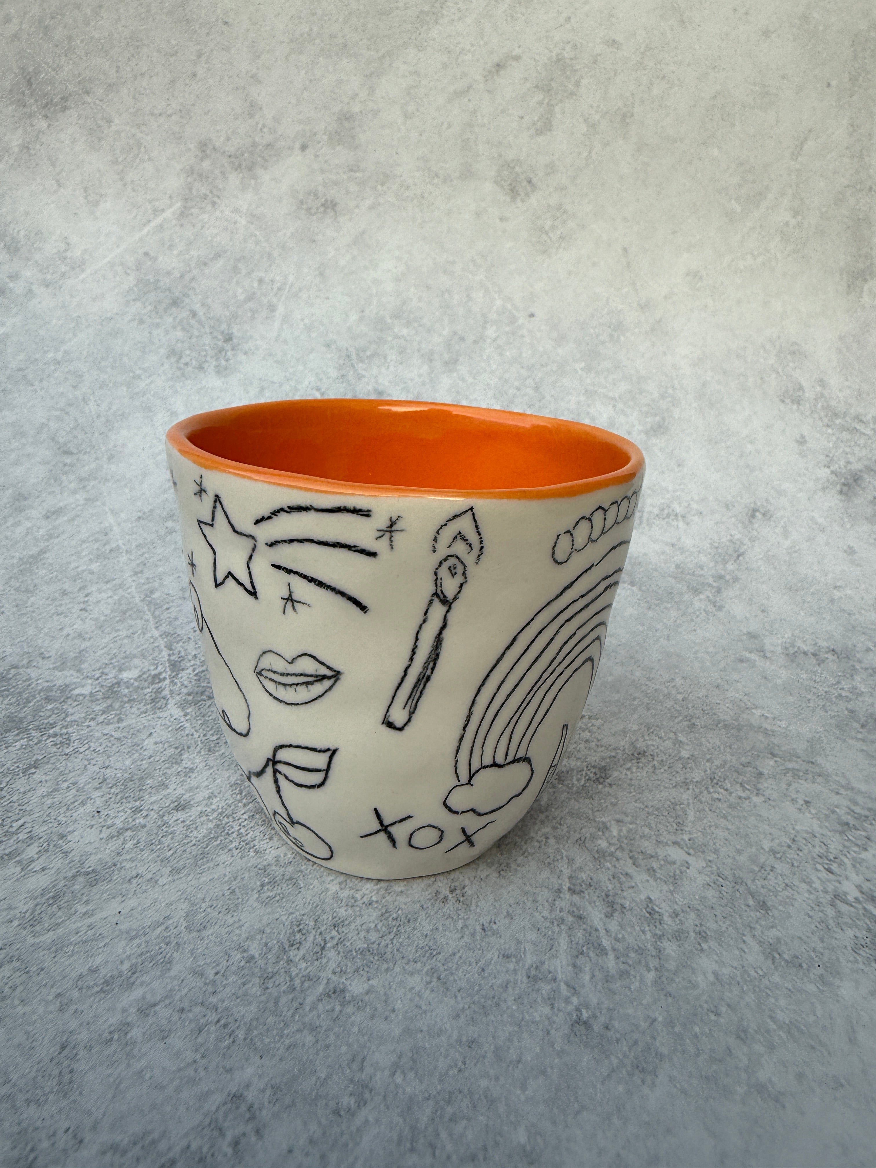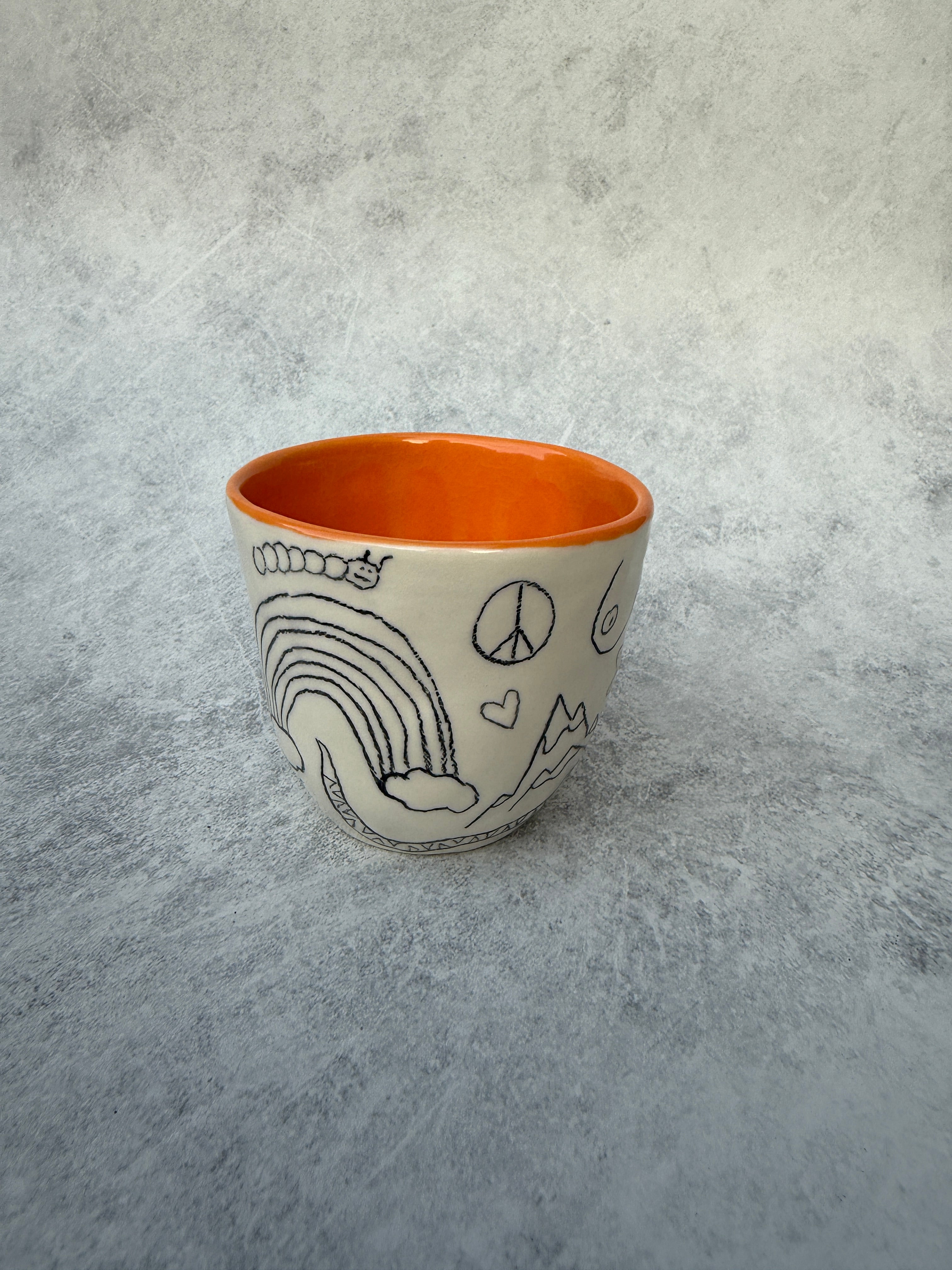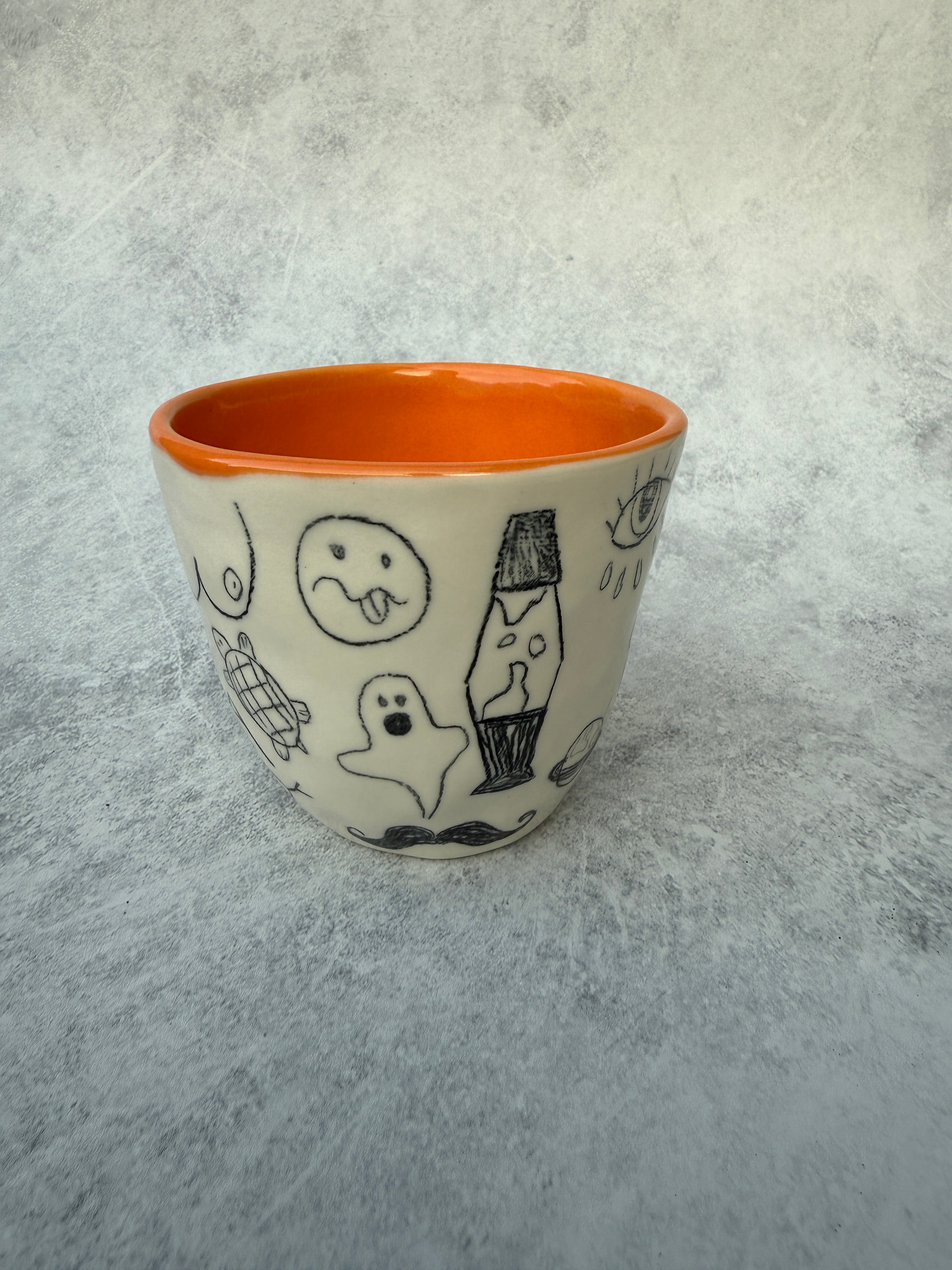 This cute little doodle cup will make ya smile when you fill it with your next beverage. Glazed inside and out with clear glaze with pencil like sketches.