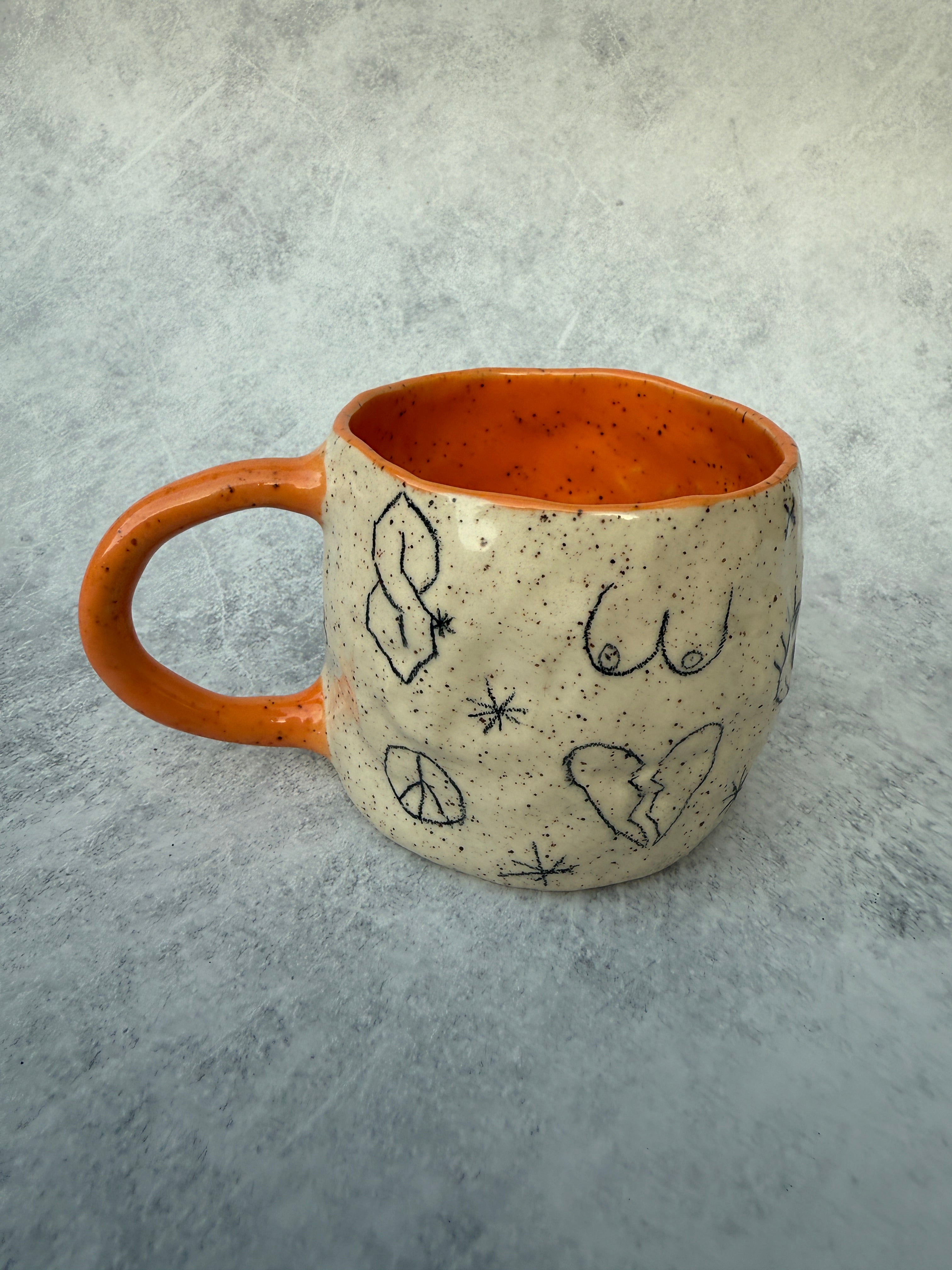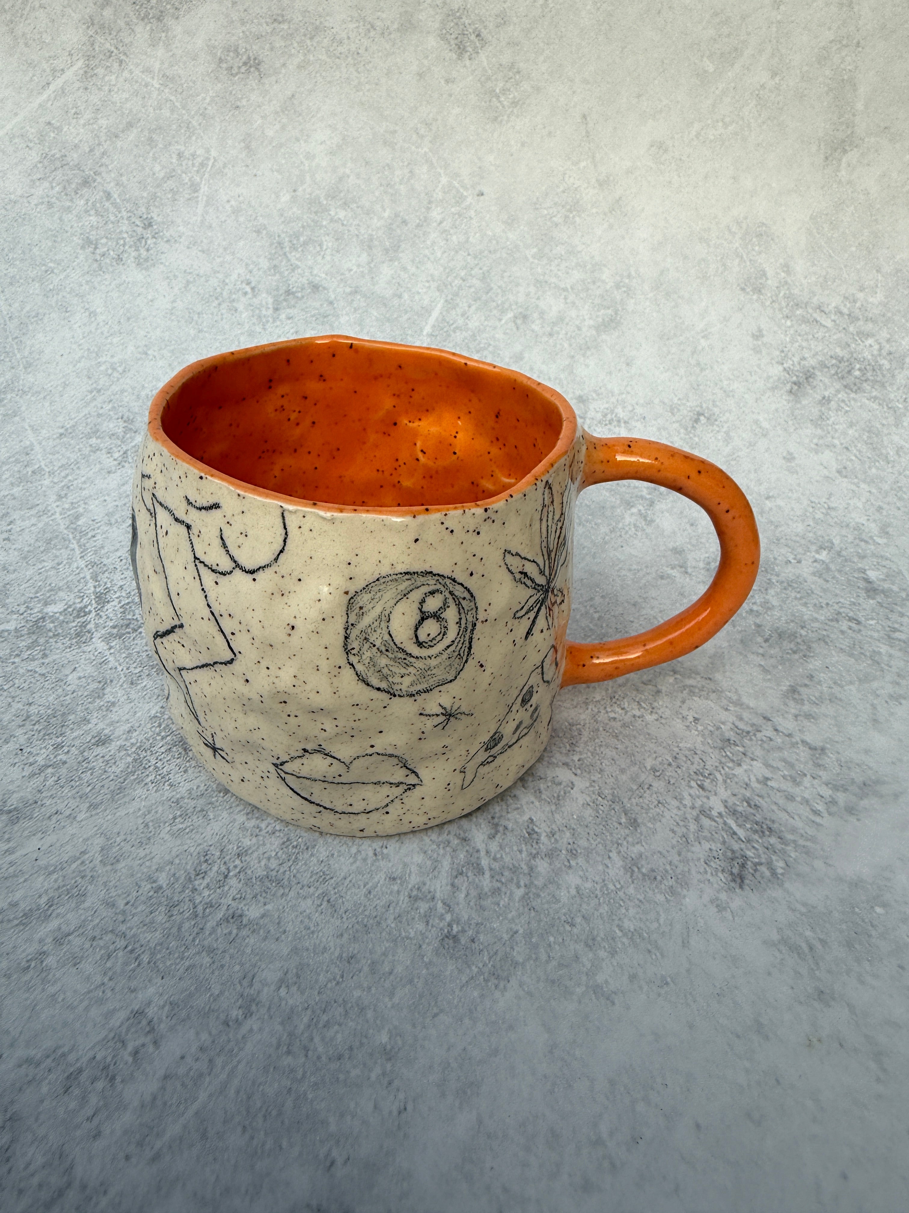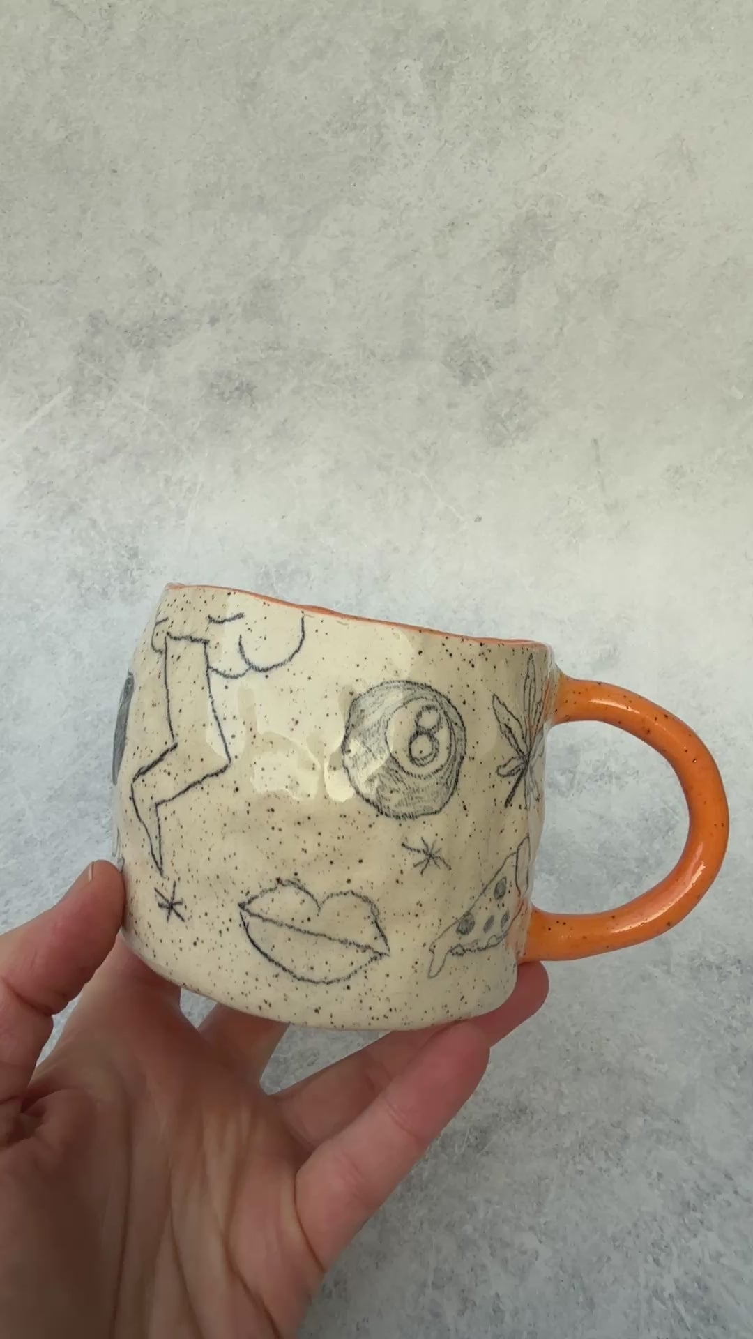 This hand built mug has all the fingerprints and feel you could want in a cute doodle mug. Glazed inside and out with clear glaze with pencil like sketches.