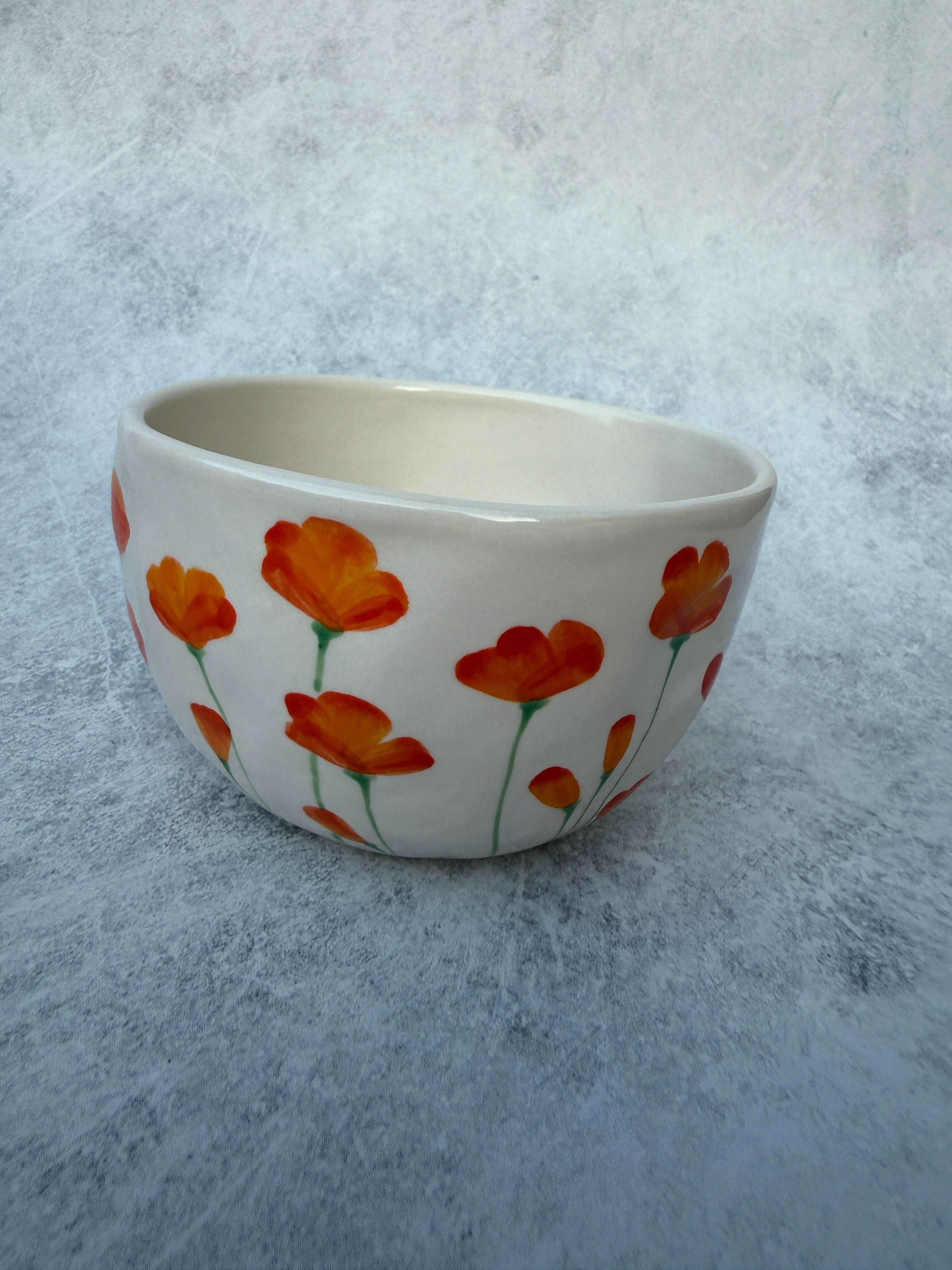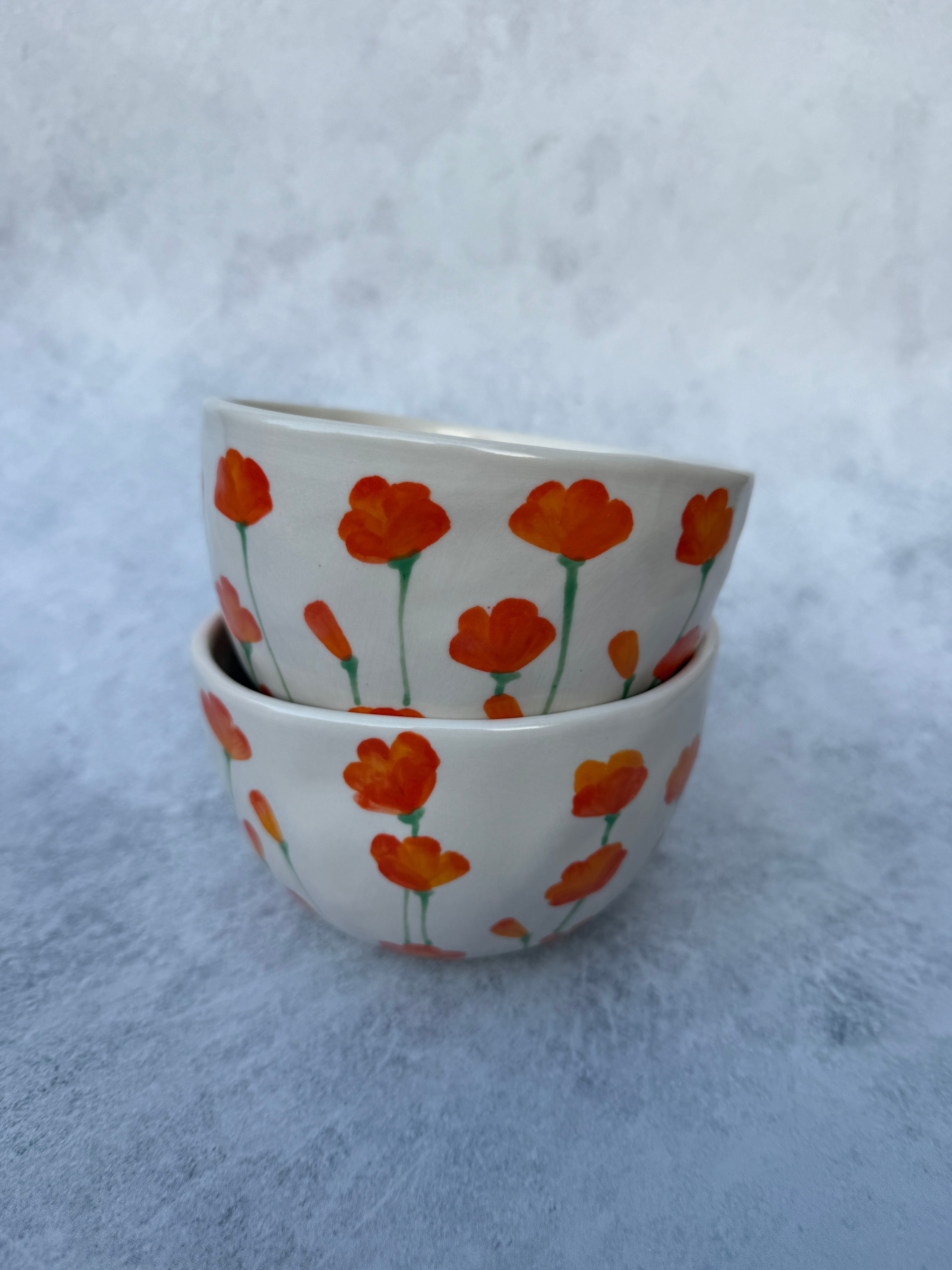 Snap, Crackle, and Poppy! Pour your next bowl of cereal into this medium sized hand painted porcelain poppy bowl! A piece very popp-ular with Californians and out-of-staters alike.