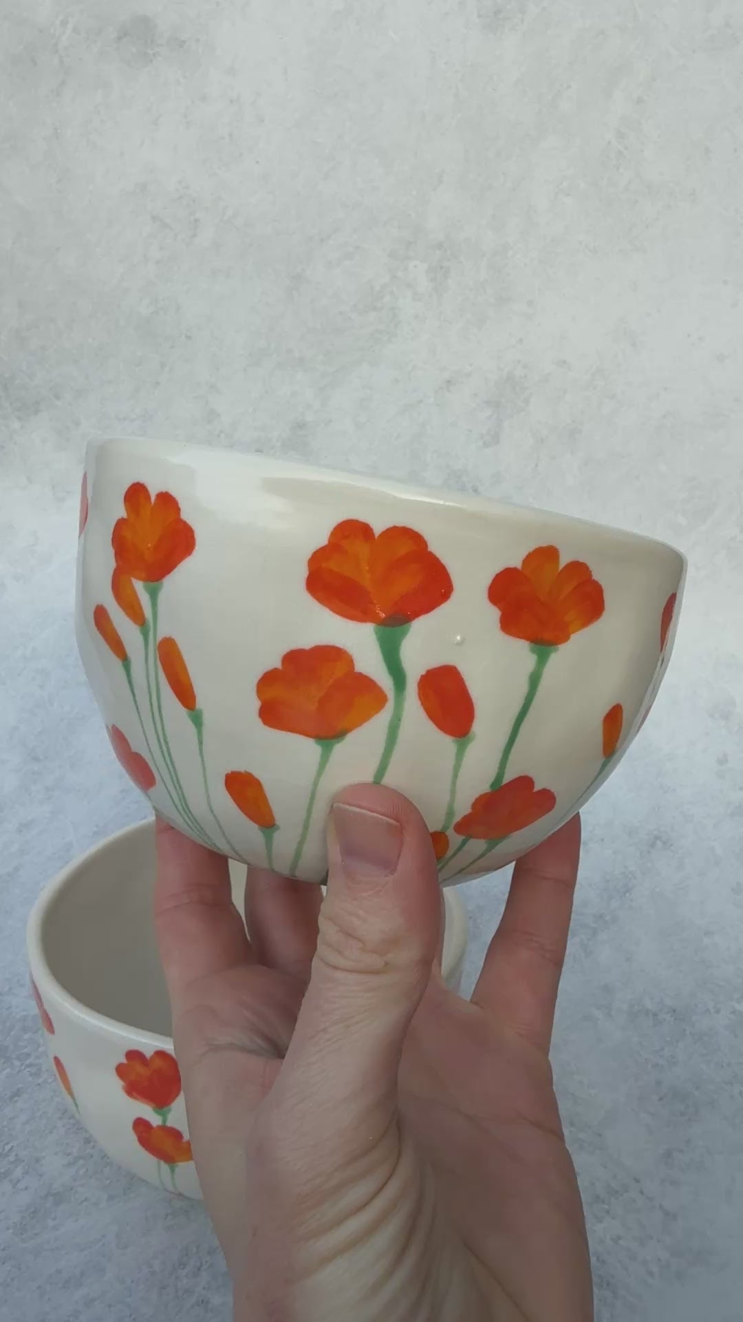 Everything is hand made with love. The inside is glazed with a glossy glaze and the outside is a matte porcelain. The perfect size for a meal, or for your poppy collection.