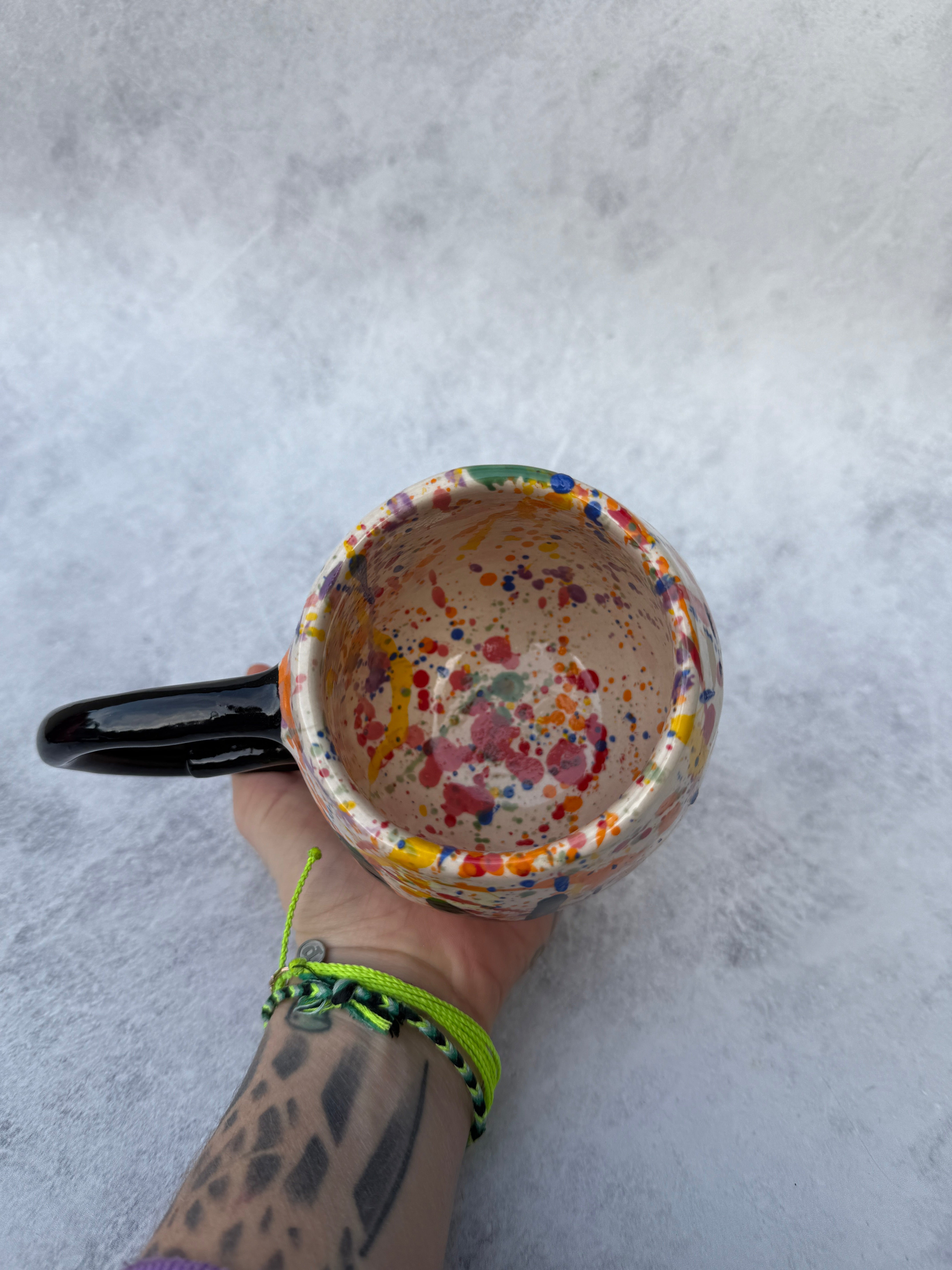 Splattered with all the colors of the rainbow!! this 16oz mug combines style and symbolism to make a stand-out piece of functional pottery!