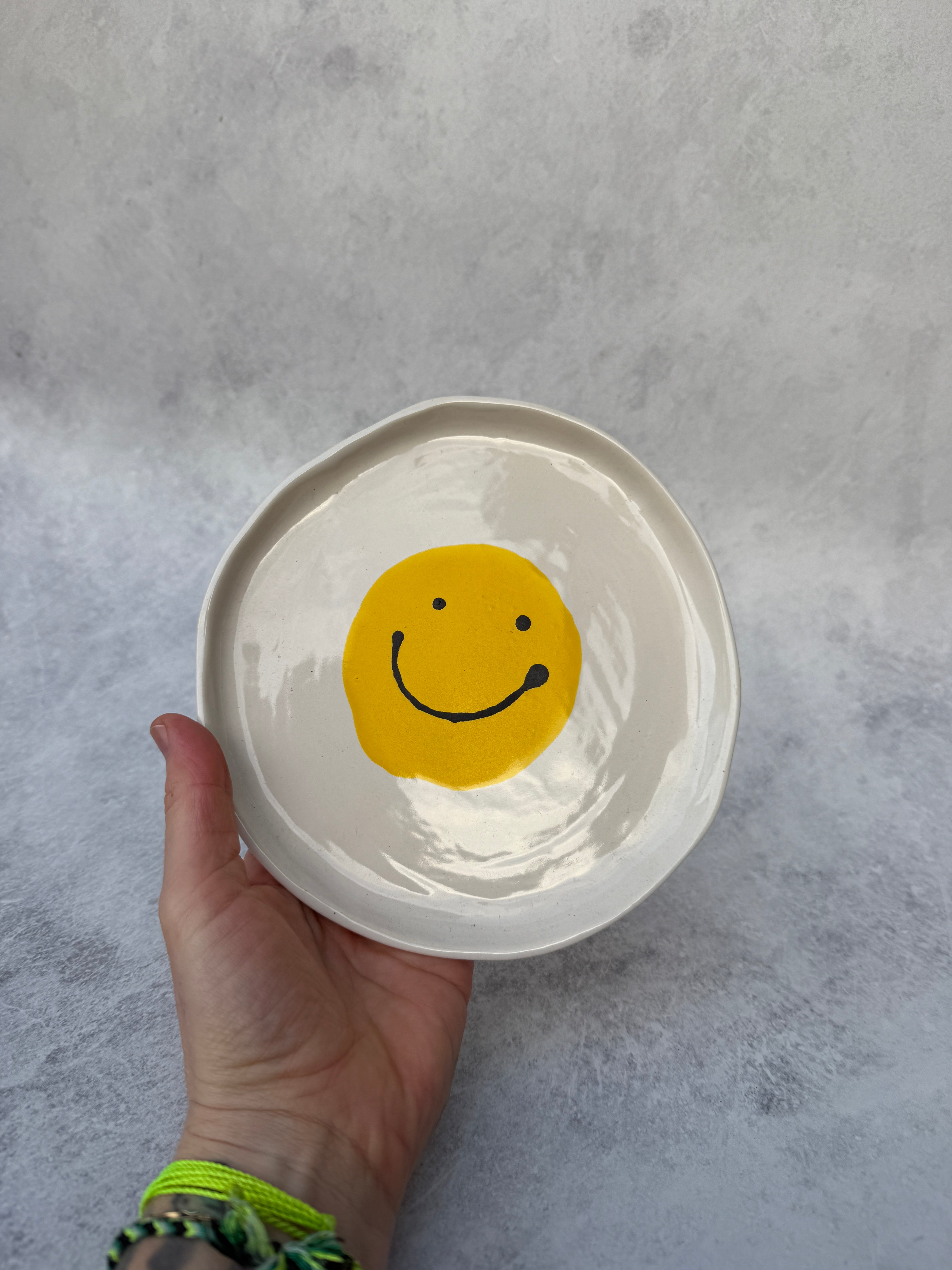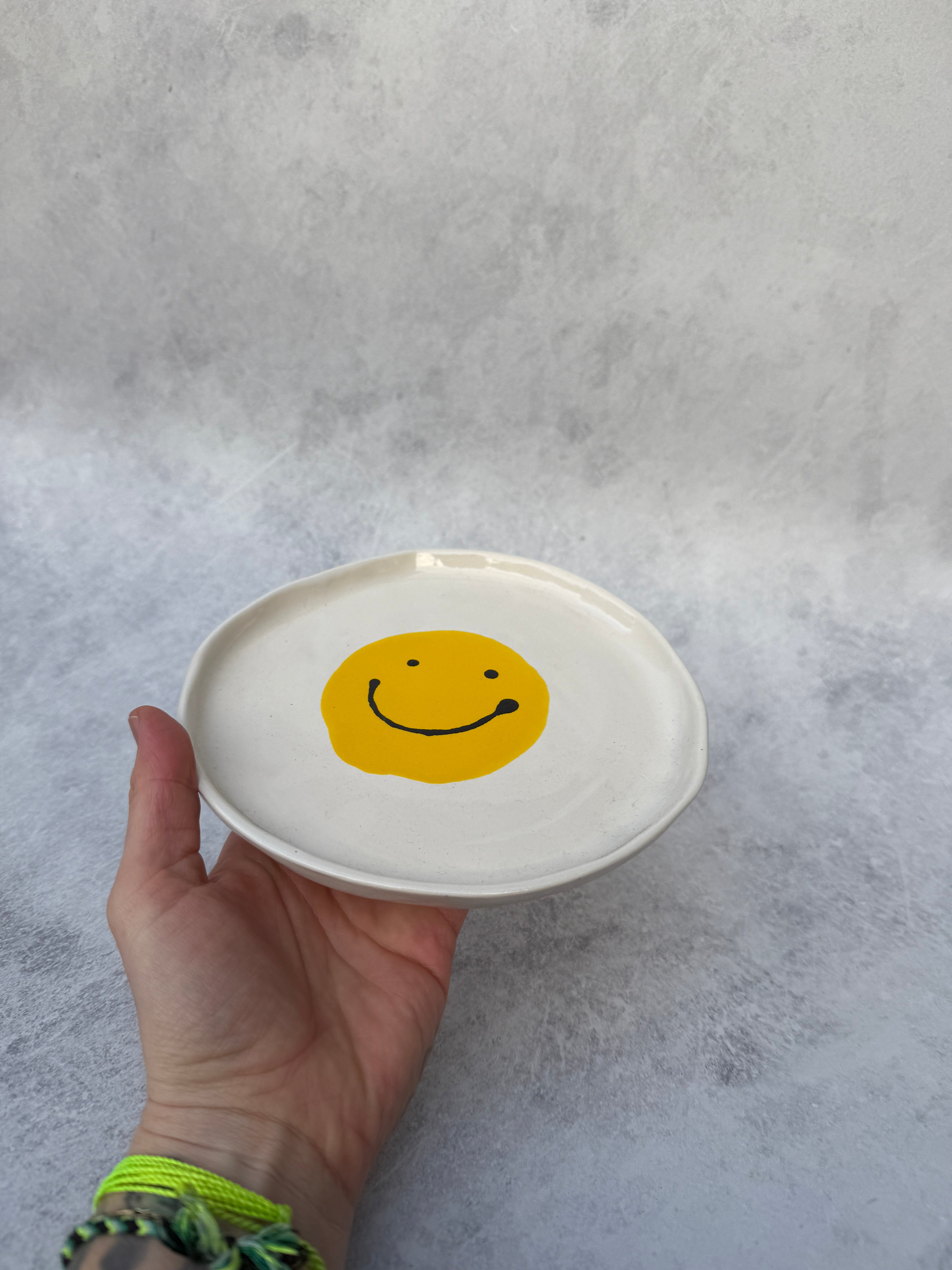 cute happy 7 inch plate with a matte yellow smiley on a glossy glaze.